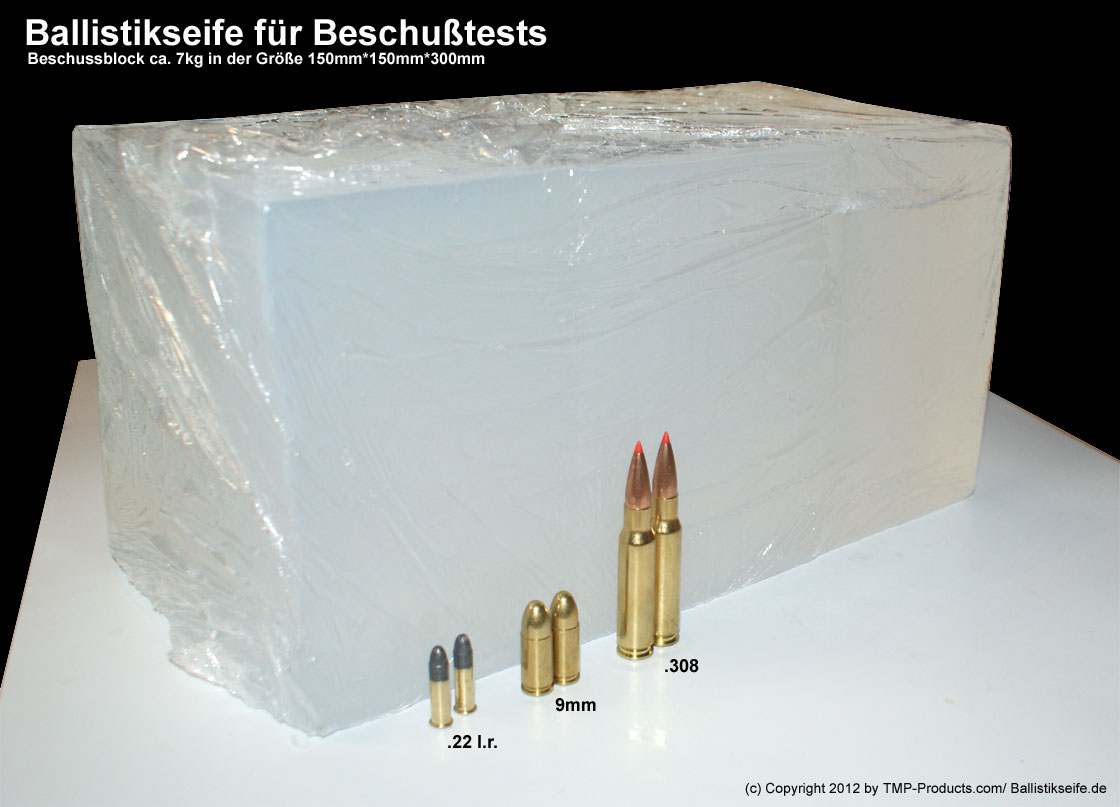 Die ballistische Seife eignet sich hervorragend für Ballistische-Tests und Untersuchungen bei denen menschliches Gewebe Gegenstand der Untersuchung ist oder man Versuche zur Untersuchung von Geschossen, Geschoßdeformation, bzw. Aufpilzung und Wundballistik vornehmen möchte.